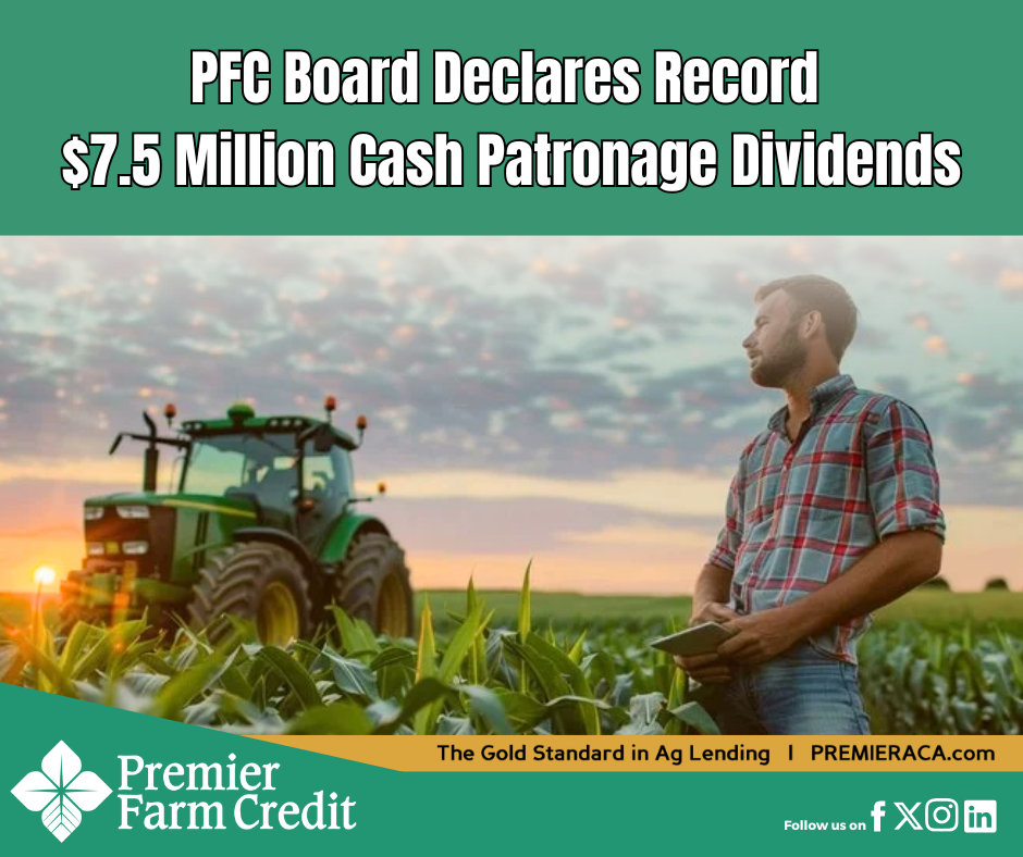 “Returning patronage to our customers is one of the most meaningful ways we fulfill our cooperative mission,” said Chris Hornung, President and CEO of Premier Farm Credit. “This $7.5 million distribution reflects the strength of our portfolio, the trust our customers place in us, and the dedication of our team to providing reliable financial solutions year after year. This year’s patronage equals a little over 33% of our net income.”